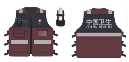 馬甲——主面料采用防水、透氣的貼膠尼龍牛津紡布料,使用銀灰色熒光條進行橫向分割,充分保證了野外工作的要求。左胸上部標識為“衛(wèi)生系統(tǒng)統(tǒng)一形象標識(豎向標準組合)”圖案,背部標識為銀色反光字(中國衛(wèi)生CHINA HEALTH)。