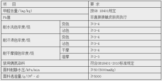 面料理化特性需要達到下表的技術要求,并提供符合下表要求的第三方檢測報告。