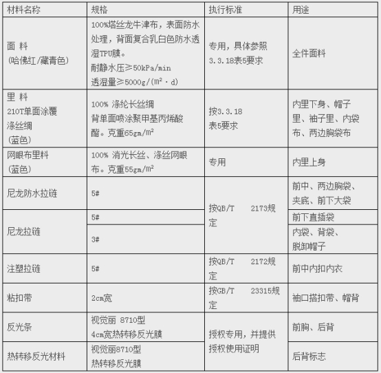 采用專用的哈佛紅和藏青色搭配,該顏色應符合《中國衛(wèi)生應急服裝技術規(guī)范(試行)》要求,并須提供該顏色的色卡布料,以此作為評價依據。